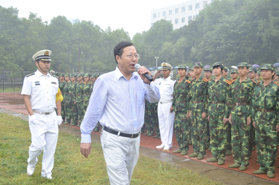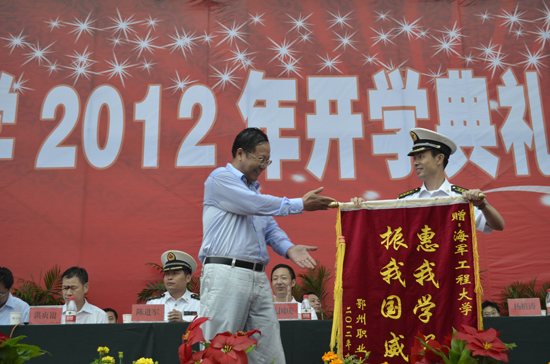 校党委书记杨植涛检阅了新生方队,并代表学校向海军工程大学承训部队赠送锦旗。