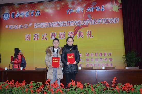 12月1日—2日,“高教社杯”湖北省第三届高校师范生教学技能竞赛在黄冈师范学院隆重举行。本次竞赛由省教育厅、湖北省高等学校师范教育联盟主办,共有来自全省24所高校的74名师范生参加了决赛。决赛由撰写教案、即兴演讲、模拟授课3个环节构成,代表我校参赛的管理学院初等教育(文)专业学生赵雪、哈丽萍不畏强手、顽强拼搏,经过激烈角逐,两位选手都获得了三等奖的佳绩。
