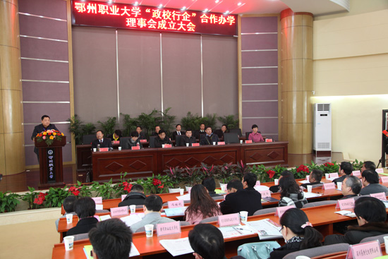 12月6日,鄂州职业大学“政校行企”合作办学理事会在求真楼学术报告厅举行成立大会。教育部职业教育与成人教育司教产合作处处长林宇,省教育厅职业教育与成人教育处副处长余弢,市委常委、宣传部长刘建平,市人大副主任陈少杰,副市长程少云,市政协副主席陈茉莲到场祝贺。省内近十家兄弟职业院校领导,鄂州市近二十家相关单位、行业领导及国内近百家企业领导参加成立庆祝大会。市政府副秘书长谢和平、校党委书记杨植涛分别主持理事会成立大会和庆祝大会。