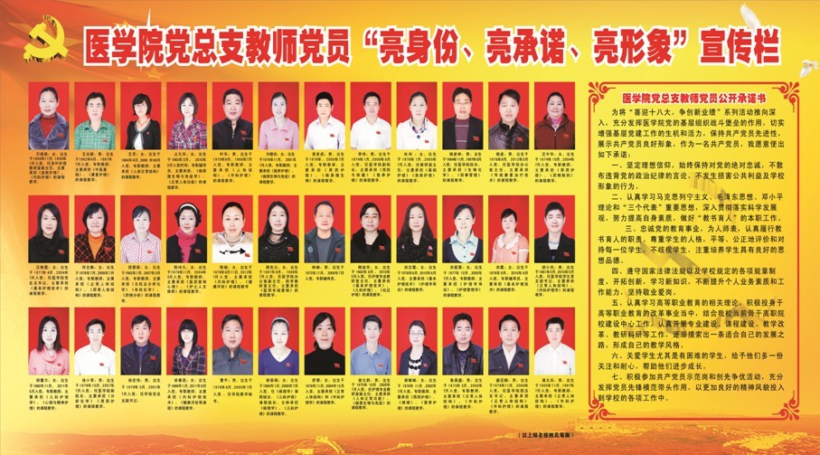 为深入学习贯彻十八大精神,医学院党总支以“总支创先进、岗位争先锋、党员争优秀”为目标,组织开展了党员“亮身份、亮承诺、亮形象”的活动。总支在党员活动室和学院的大厅内将党员的照片、岗位和公开承诺情况在宣传栏内公示,接受群众的监督。“三亮”活动的开展全面提升了医学院党组织和党员的良好形象,增强了学院为师生服务的意识,切实把党员的先进性要求公开化、岗位化、形象化,充分发挥了广大党员的先锋模范作用,激励广大党员群众为提升学校办学品质做出更大贡献。 医学院党员“三亮”活动,把党员的身份“亮”了出来,使党员的作用“强”了起来,将党员的形象“树”了起来,全院党员用实际行动响亮地喊出:“从我做起、向我看齐、对我监督”口号。如今,“我是党员、我亮牌”已成为医学院全体党员的自觉行为。