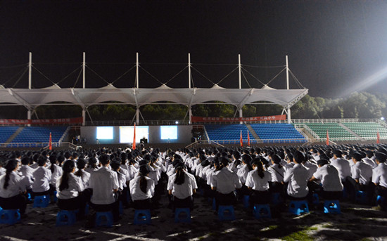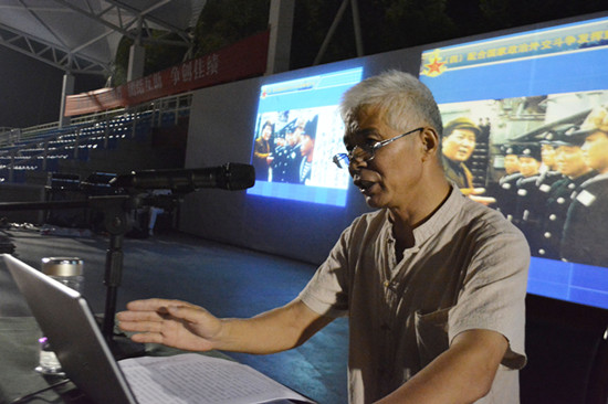 本网讯(学生记者陈秋宇 王俊 刘晓辉/文 黄宇颖 黄瑶/摄)9月19日是国防教育日,晚7点,海军工程大学李松祥教授在本部体育场为我校5200余军训新生作主题为“牢记历史使命,建设海洋强国”的国防讲座。校领导周岫、胡海平和军训教官、师生一起聆听了讲座。