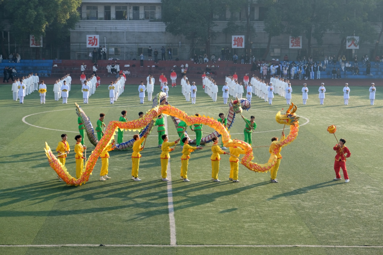 开幕式结束后,一场精彩纷呈的文艺汇演将现场氛围推向高潮。活力四射的开场歌舞《卡拉永远OK》瞬间点燃全场热情;气势磅礴的舞龙表演中,队员们动作矫健,将龙的威严与灵动演绎得淋漓尽致;动感十足的健美操以整齐划一的步伐和舒展有力的动作,挥洒出青春的激情与活力;刚柔并济的太极方阵,在一招一式中传递出中华传统文化的深厚底蕴;最后,由中职学子带来的节目《踏山河》,以激昂的旋律和坚定的步伐,奏响了青春的强音,也为即将上场的运动健儿们注入热血与力量。