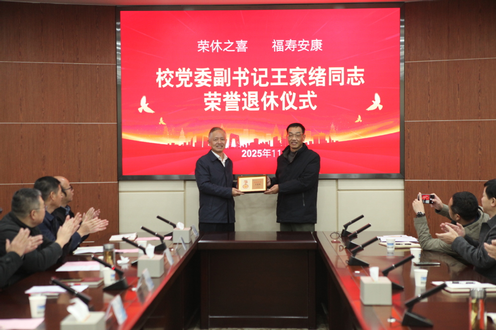 校党委书记万国光为王家绪同志佩戴红花、绶带、颁发退休证,代表校党委向其光荣退休表示祝贺,感谢他为学校事业发展所作的贡献,祝福他的退休生活丰富多彩、快乐常伴,并号召全体党员干部向王家绪同志学习,锤炼党性、开拓创新、勇于担当,为推动学校高质量发展贡献更多力量。