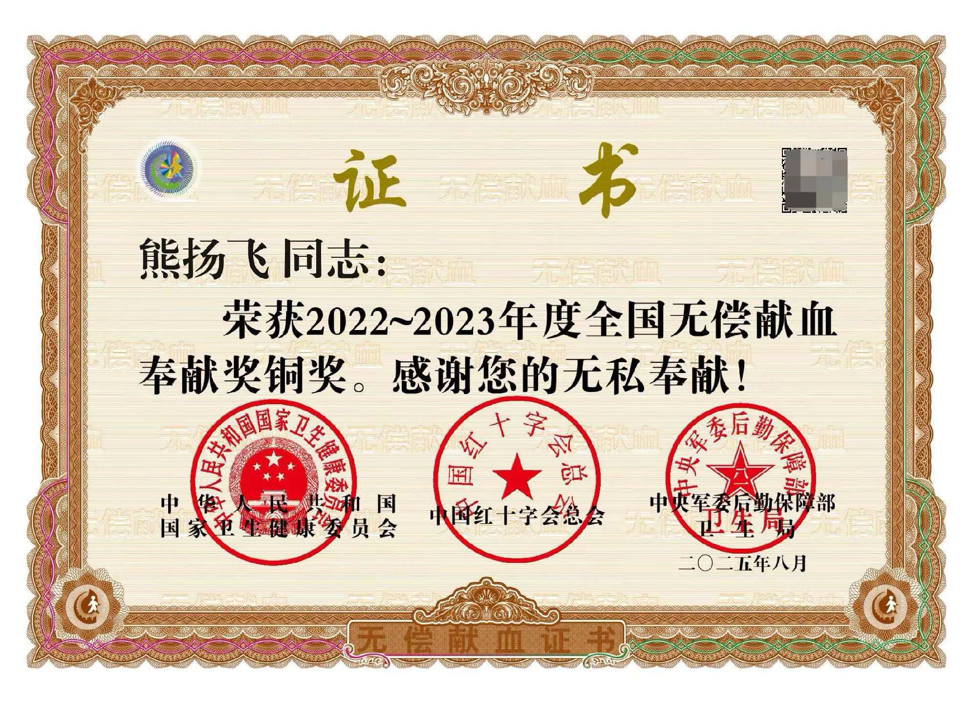 本网讯(通讯员 万前锋)近日,国家卫生健康委等部门联合表彰2022-2023年度全国无偿献血奉献奖获奖者,我校航空工程学院2024届毕业生熊扬飞荣获铜奖。该奖项每两年评选一次,是国家对长期坚持无偿献血志愿者的崇高表彰。