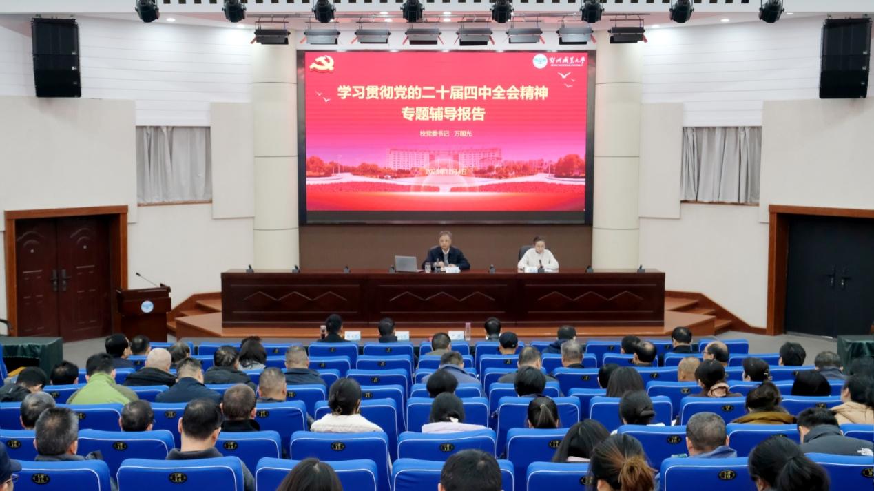 本网讯(记者 何建华)12月4日,我校在图书馆二楼学术报告厅召开学习贯彻党的二十届四中全会精神专题辅导会。校党委书记万国光结合中央、省市相关要求与个人学习思考,为全体与会人员作了一场深刻而务实的辅导报告。校纪委书记严莉主持会议。全校副科级及以上干部、党支部书记、马克思主义学院教师参加学习。